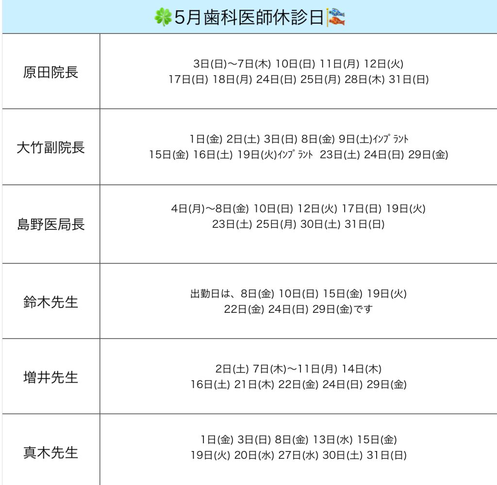 お知らせ TOP新着情報一覧お知らせ5月歯科医師休診日 5月歯科医師休診日 2026.4.16 5月の歯科医師休診日です。 ご予約はお電話またはWEBにてお願い致します。 Tel03-3988-0641